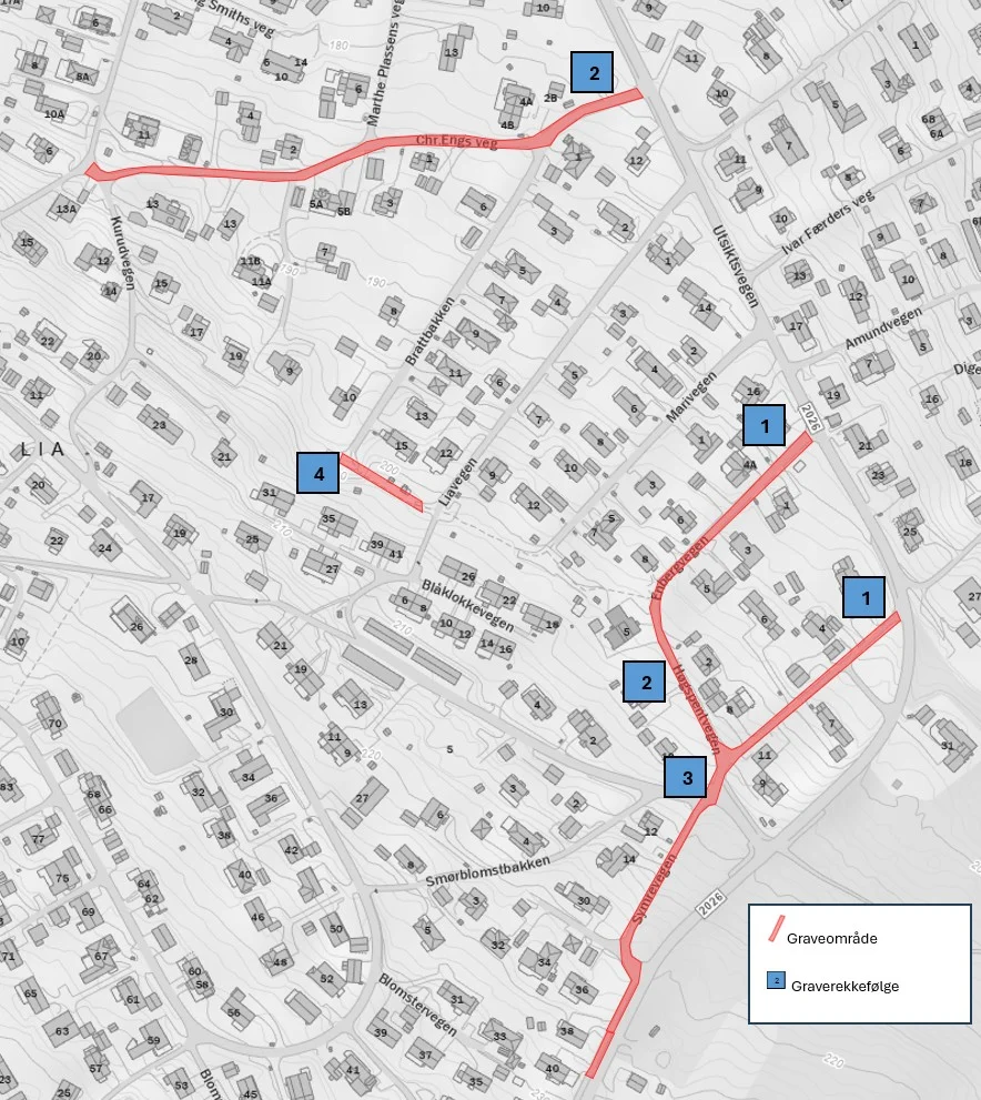 Totalt skal det graves 910 meter og det er planlagt at 2 gravelag skal graves samtidig i de ulike vegene.